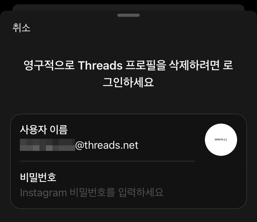 4. 프로필 삭제를 누른 후, 계정 삭제를 위해 인스타그램에서 설정했던 비밀번호를 입력하게 되면, 스레드 계정은 계정 삭제 상태로 바뀌며 인스타그램 프로필 배너에서 스레드 계정이 숨겨집니다.