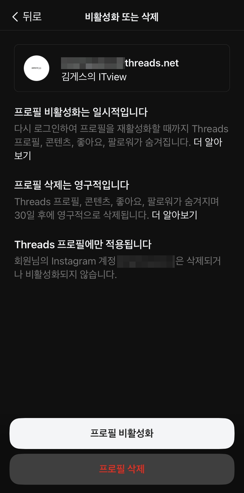 3. 프로필 비활성화 및 삭제메뉴로 들어가게 되면, 프로필 비활성화와 프로필 삭제 가 있습니다. 프로필 비활성화를 하게 되면, 계정은 삭제 대신 프로필에서 계정이 잠시 가려지며 휴면로 바뀌며 로그인 시 다시 계정이 활성화됩니다. 프로필 삭제는 30일 후 스레드 계정이 영구적으로 삭제됩니다. 인스타그램 계정과 동시에 삭제되는 것이 아닌 스레드 계정만 삭제되는 것입니다.