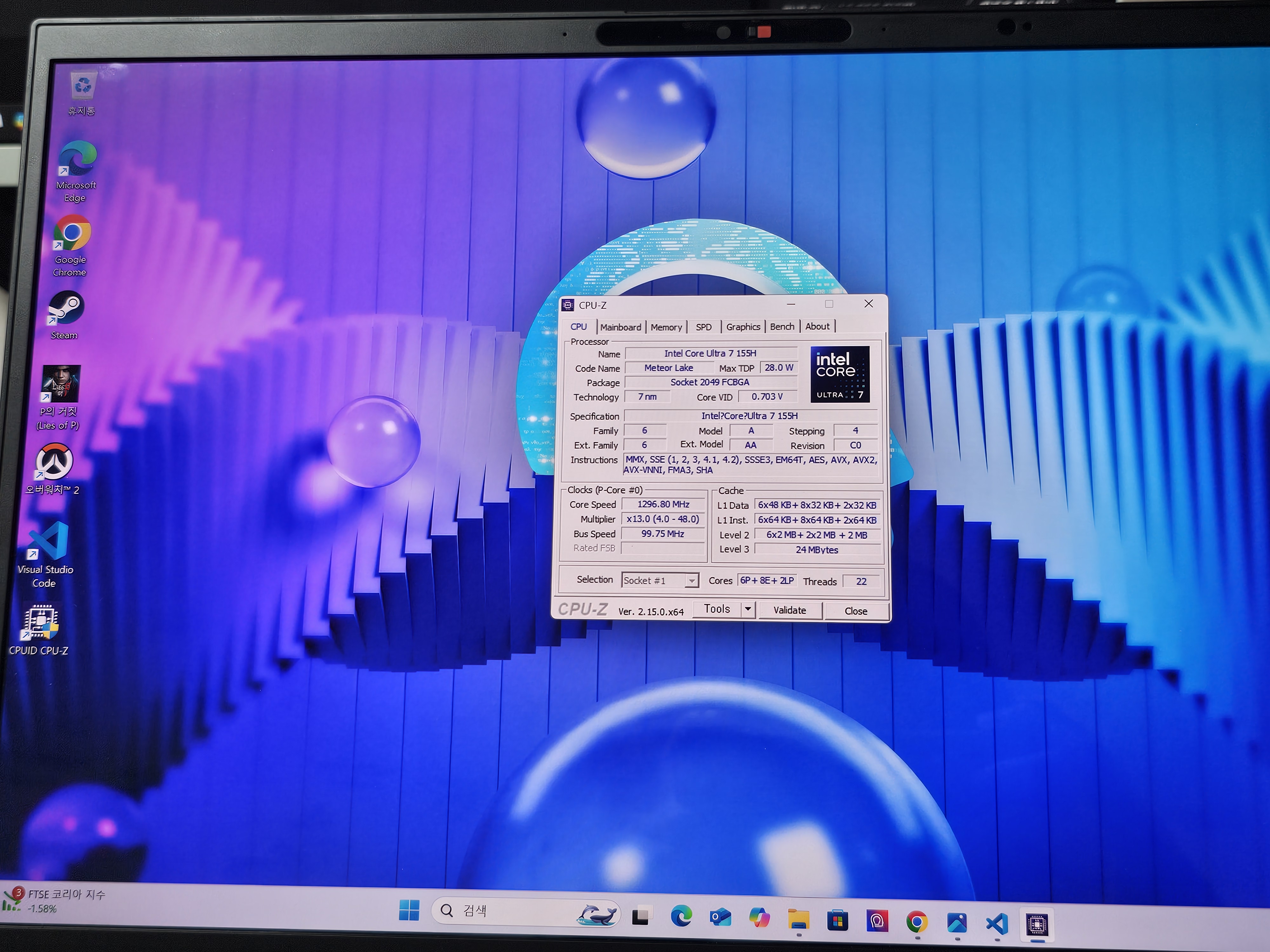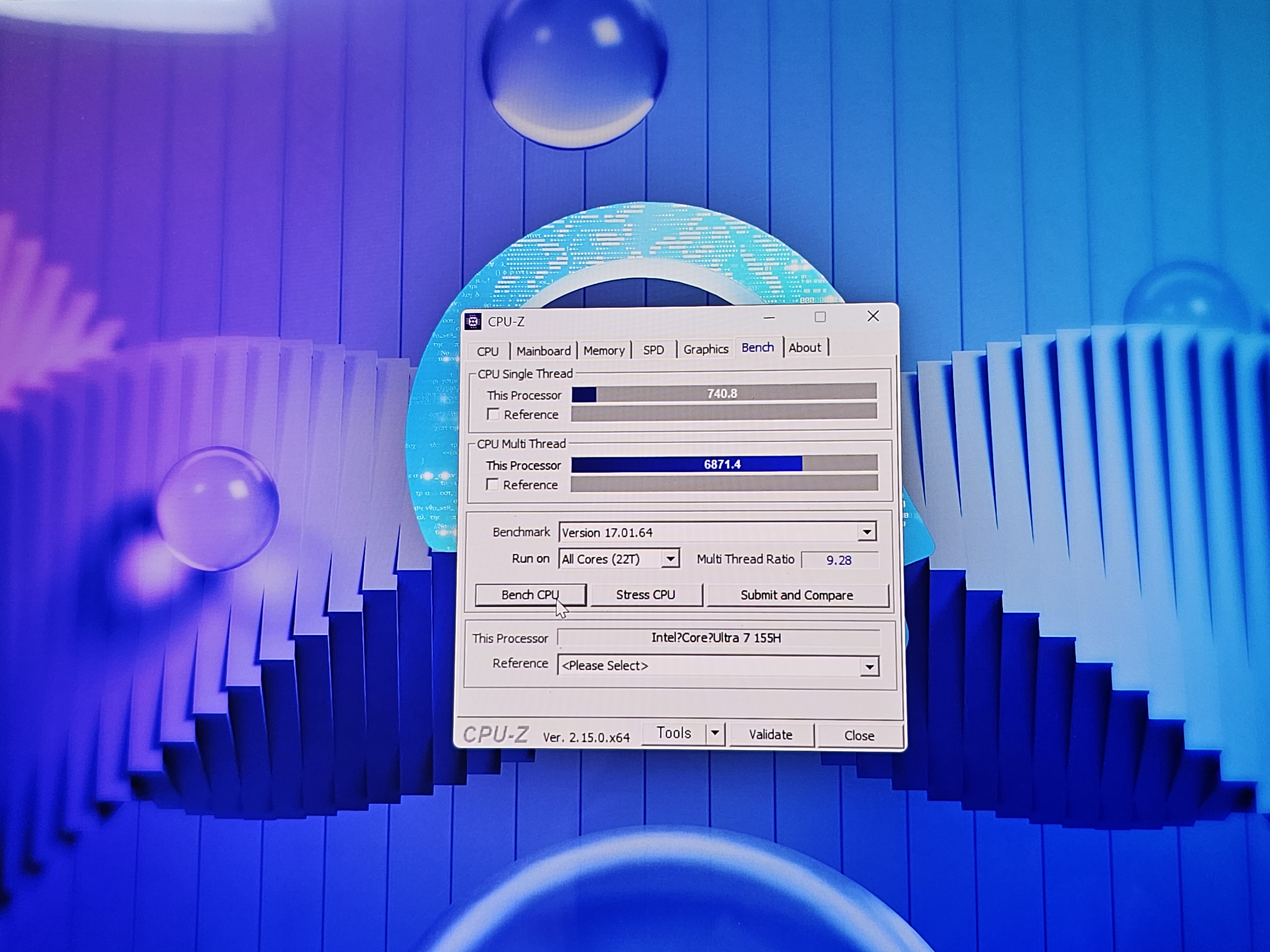 간단하게 MSI 프레스티지16 AI B1MG의 성능 테스트를 CPU-Z를 통해 기본적인 사용과 벤치 점수를 확인해보았습니다. 프레스티지16 AI B1MG에 탑재된 인텔 울트라7 155H CPU는 싱글코어 기준 740점대, 멀티코어 6800점 대 정도의 성능을 보여주었습니다. 일상적인 작업이나 작업용으로도 부족함 없는 성능입니다.