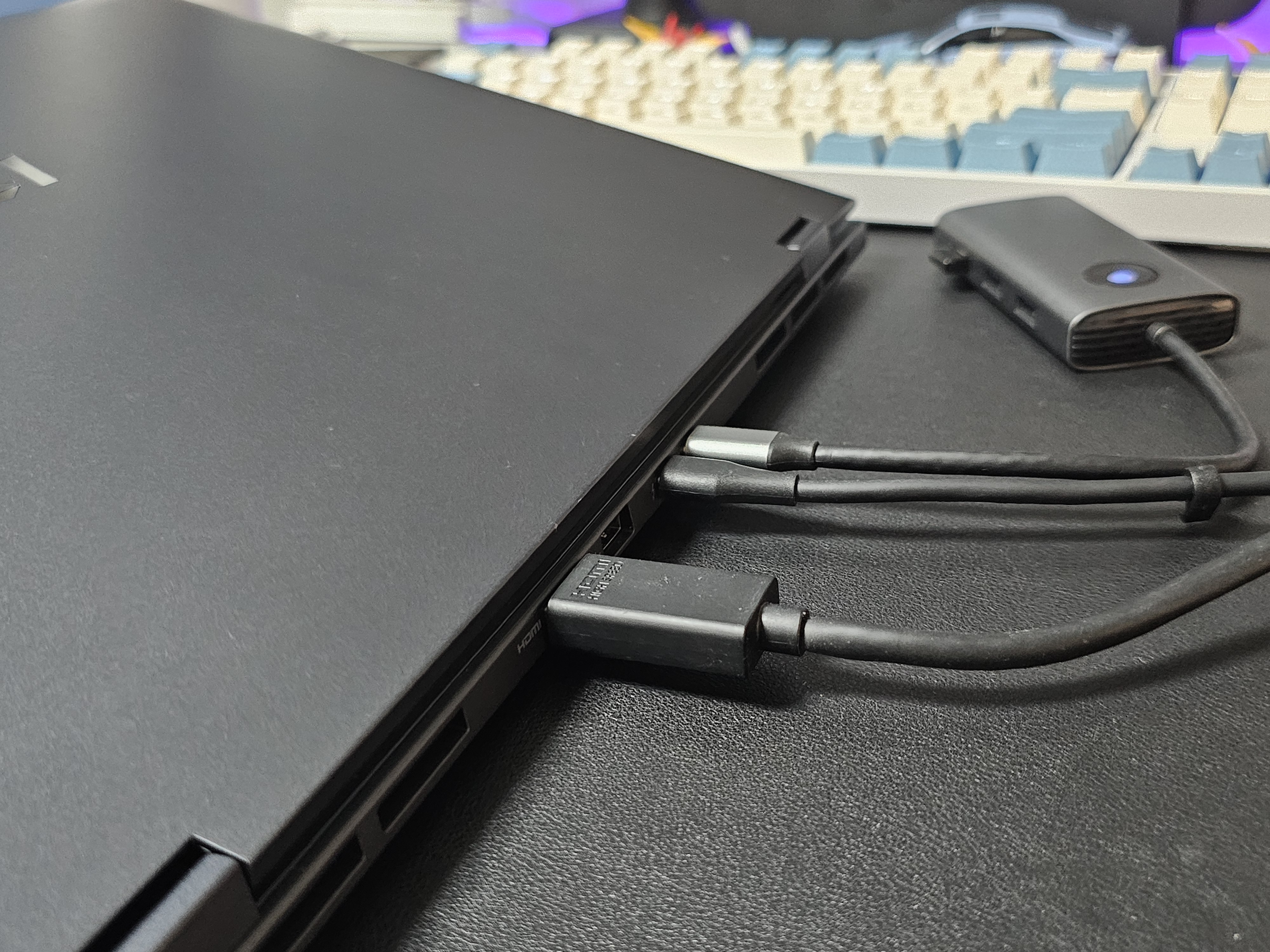위에서 언급하였듯 주요 포트들이 후면에 위치하고 있어 HDMI와 전원 포트 등 모니터와 연결해 사용할 때는 선들이 뒤로 깔끔하게 정리되는 것은 분명 큰 장점이었습니다. 하지만, 저는 USB허브를 추가로 연결하여 마우스나 USB, 외장 SSD를 사용하는 경우가 있는데, 노트북 거치대 위에 올려두고 쓰는 경우 뒤에 있는 포트에 연결하여 사용하기가 조금 불편하였습니다. 이런 점은 깔끔한 환경을 만들어주는 동시에, 사용 편의성이 희생된 설계라고 느껴졌습니다.