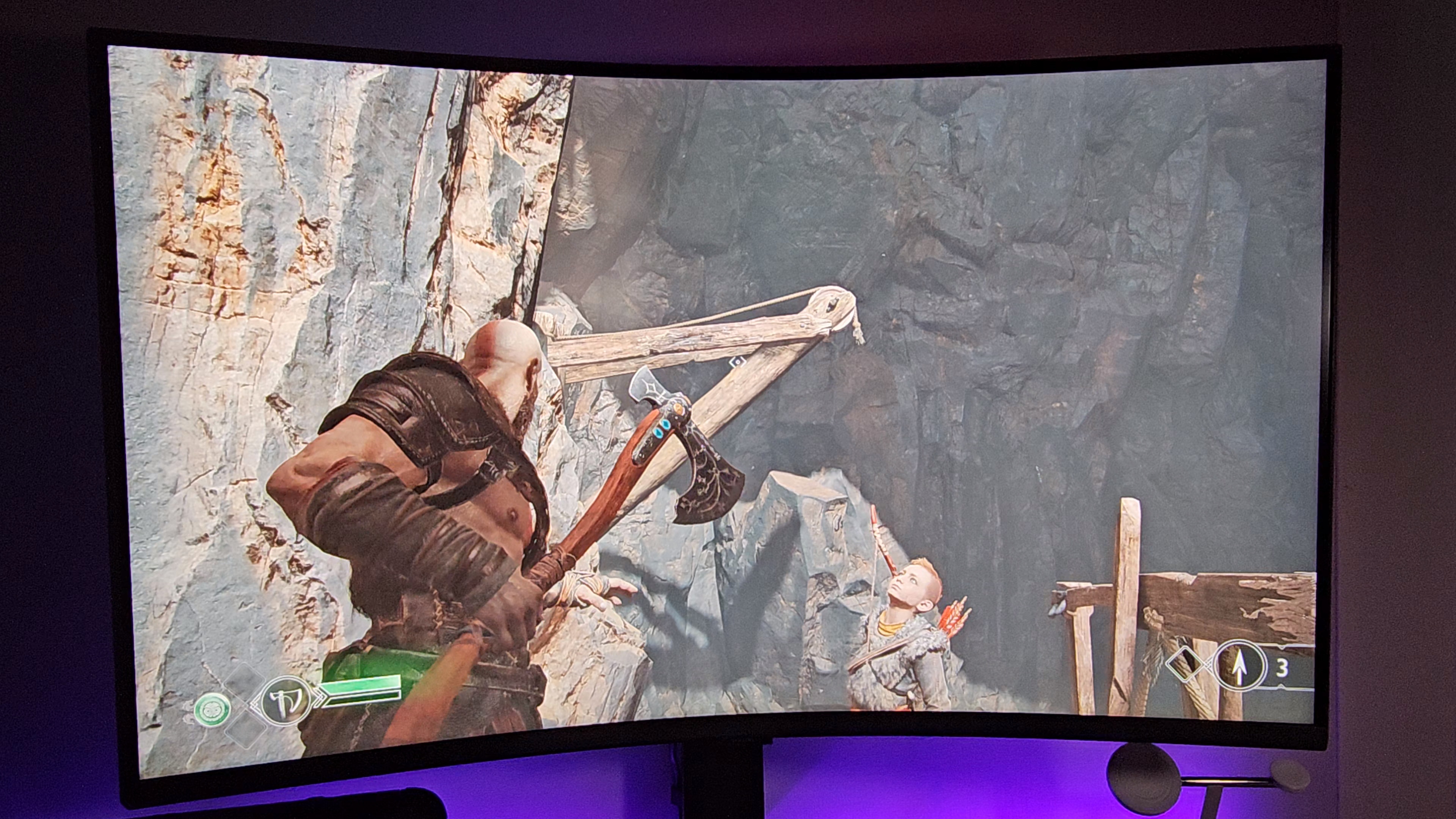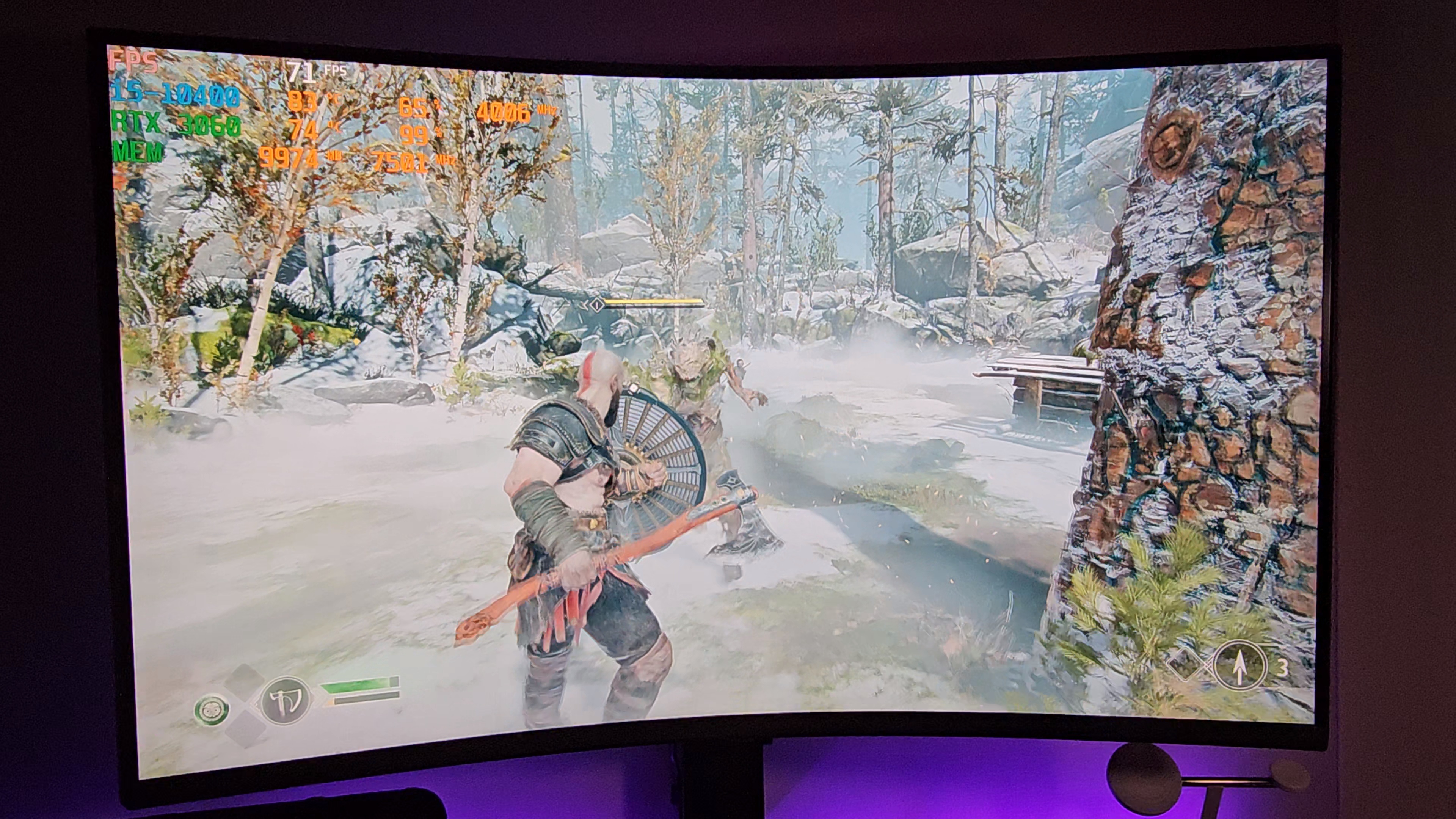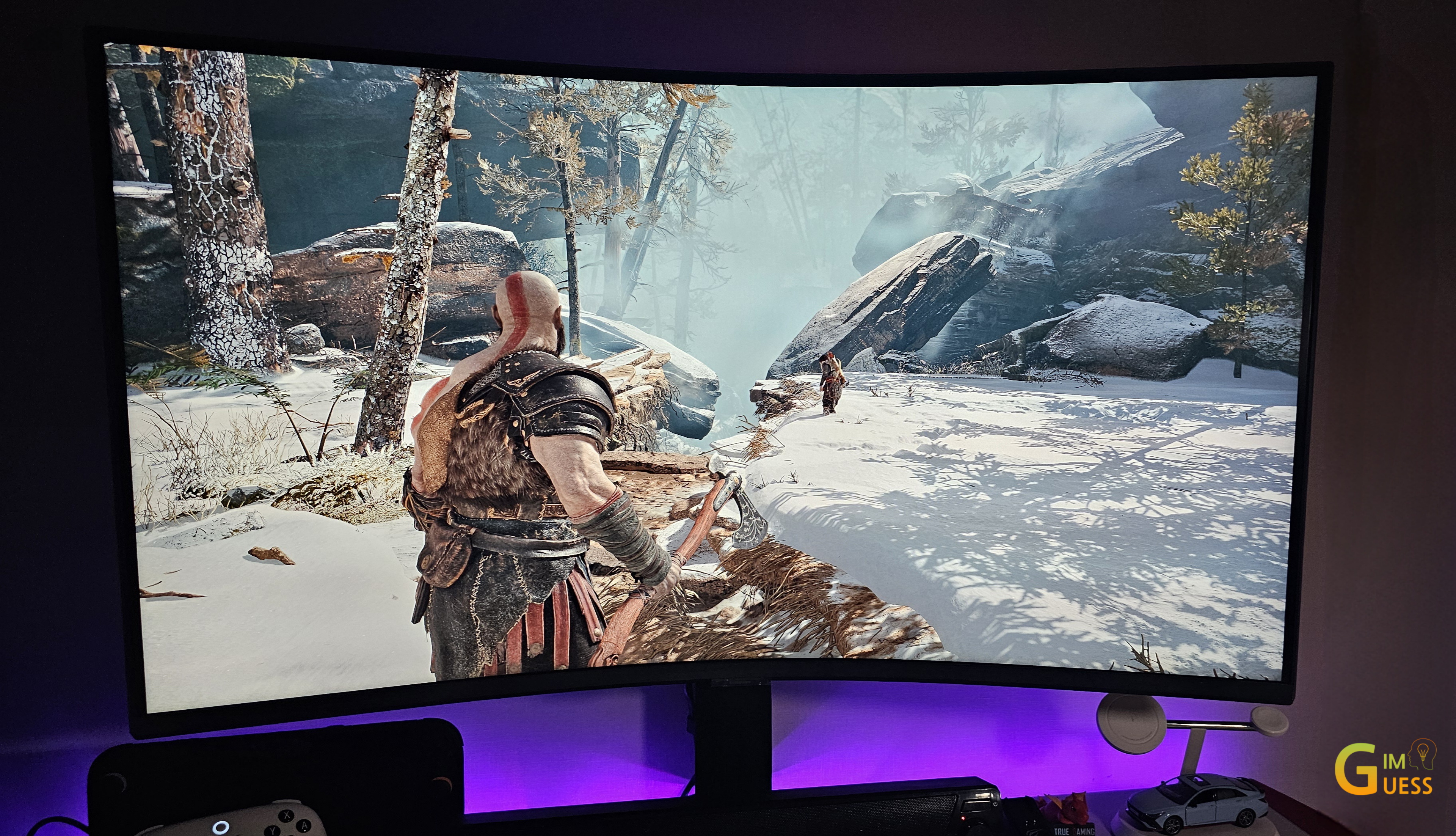 갓 오브 워를 플레이하며 가장 크게 느낀 점은 커브드 화면이 주는 몰입감이었습니다. 캐릭터의 움직임과 공격 모션이 화면 양옆까지 자연스럽게 이어져 전투에 더욱 몰입할 수 있었고, 설원과 숲에 들어섰을 때 WQHD 해상도 덕분에 나뭇가지 하나하나 선명하였습니다. 그냥 풍경을 바라보는 것만으로도 좋았습니다.
