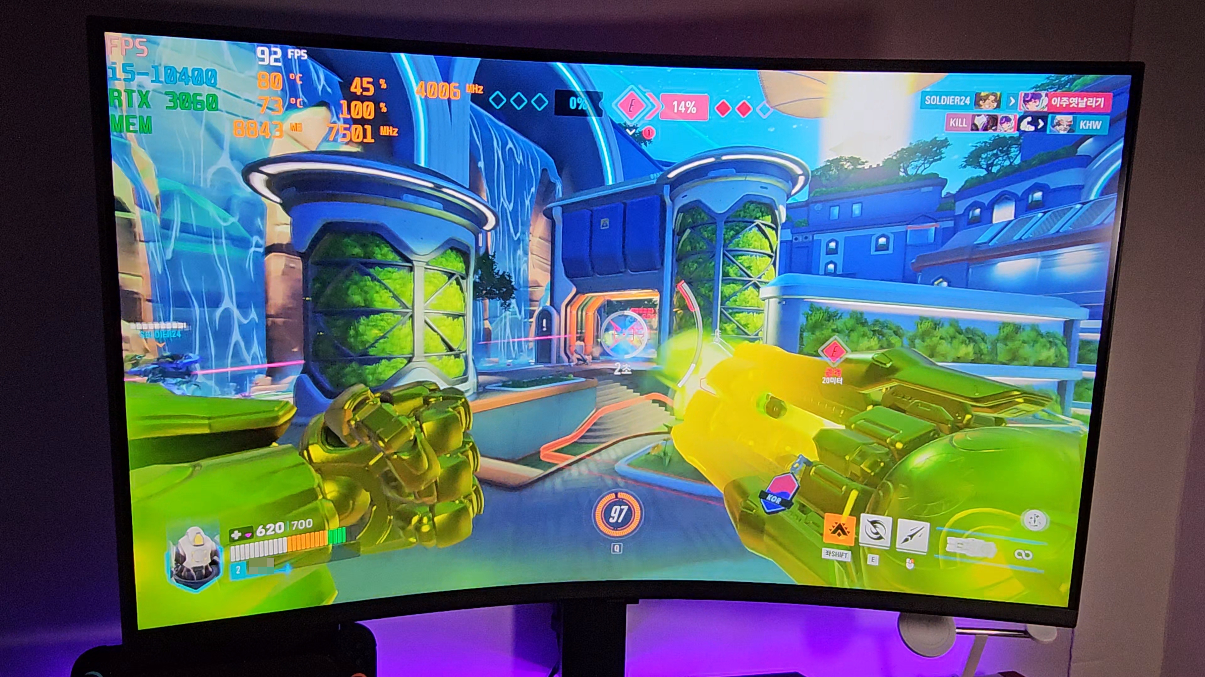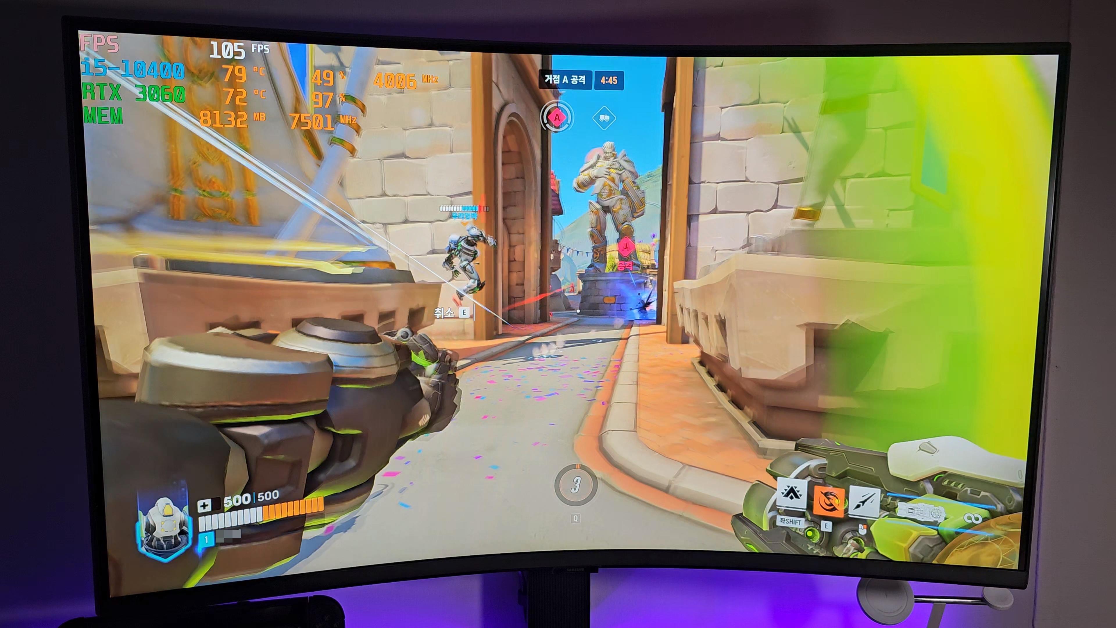 먼저 오버워치 2는 빠른 화면 전환과 순간적인 교전 상황이 많은 FPS라, 모니터 성능 차이를 바로 체감할 수 있었습니다. 기존에 사용하던 60Hz 고정인 일반 모니터에서는 미세하게 끊김이 느껴졌었는데, 오디세이 G75F에서는 에임을 움직이거나 시야를 빠르게 전환할 때 끊김 없이 부드러워 전투에 더 집중할 수 있었습니다.