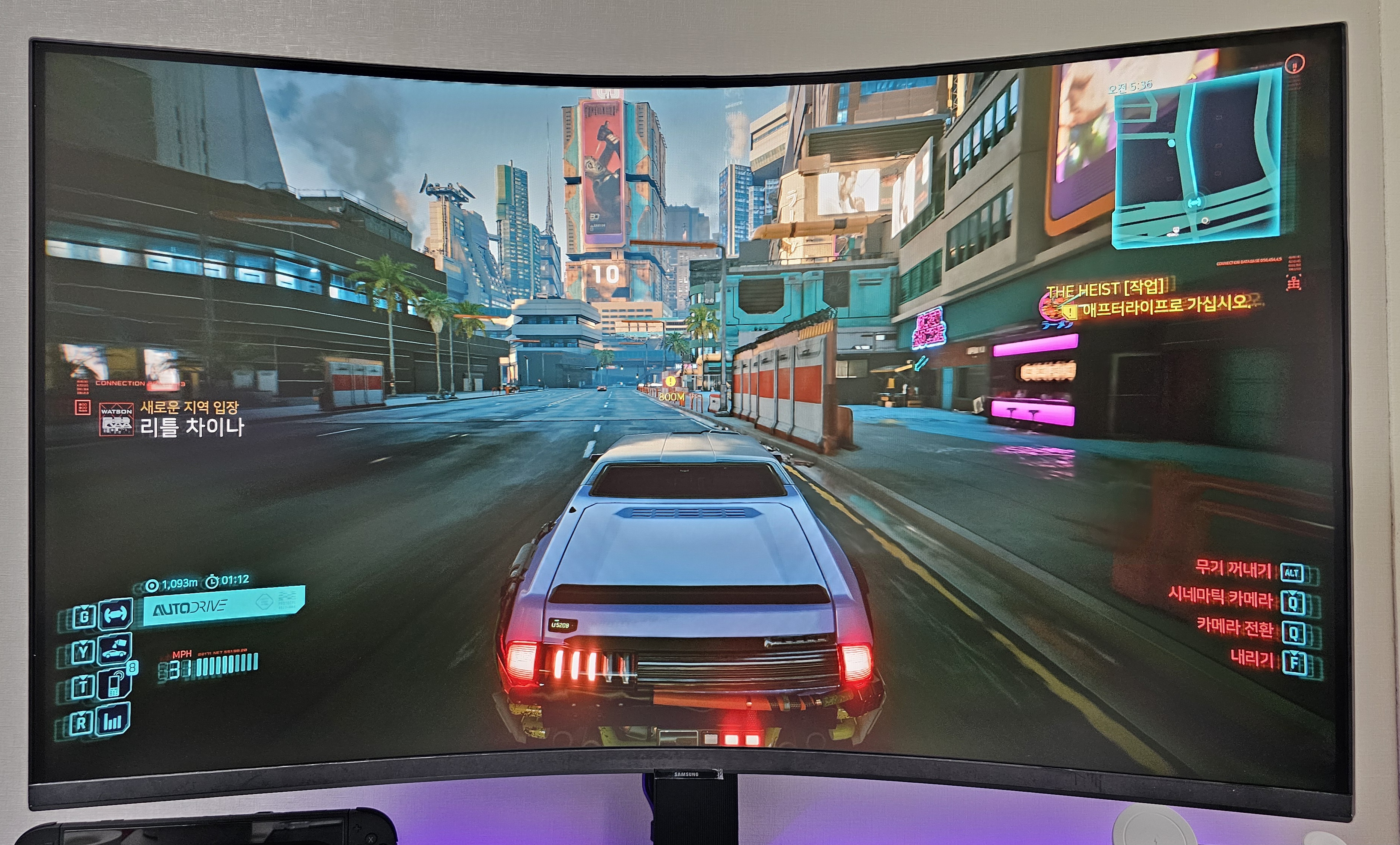HDR을 설정하여 사이버펑크:2077을 플레이하였을 때 확실히 체감이 크게 느껴졌습니다. 간판에 불빛과 차체 반사가 뭉개지지 않고 세밀하게 표현되어, 게임 속 분위기에 깊게 빠져 몰입할 수 있었습니다.