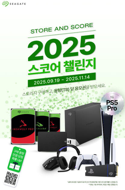 현재 진행중인 2025 씨게이트 스코어 챌린지(Store and Score 2025)에서 프로모션 대상 상품인 씨게이트(Seagate) HDD, 외장 HDD 구매시, 해당 이벤트 응모에 참여하실 수 있습니다. 행사 기간은 2025년 9월 19일부터 2025년 11월 14일까지로, 프로모션 대상 상품 구매 후, 간단한 인증으로 Ps5 Pro와 포함한 다양한 상품들을 가져가실 수 있는 이벤트가 진행중입니다. 대용량 씨게이트 제품을 구매할 계획이라면, 이번 이벤트 놓치지 말고 참고하시길 바랍니다.