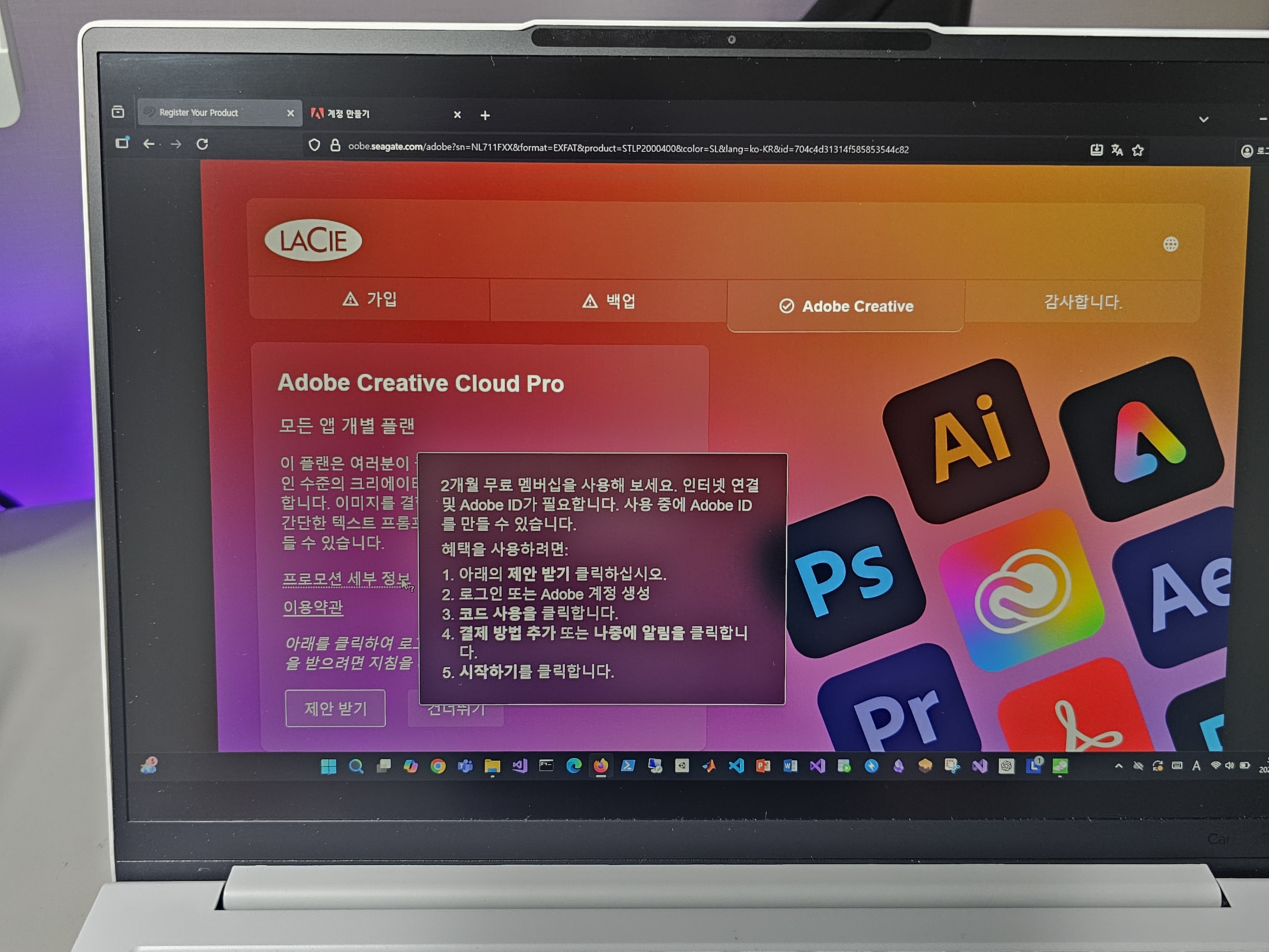 구성품에 들어있던 사용 설명서를 넘겨보다보면 드라이브를 Mac 환경 혹은 Windown 환경에 맞게 선택 후 프로그램을 열면, 제품을 등록하는 페이지와 어도비 크리에이티브 멤버쉽을 제공받기 위한 설정 페이지를 확인할 수 있습니다.