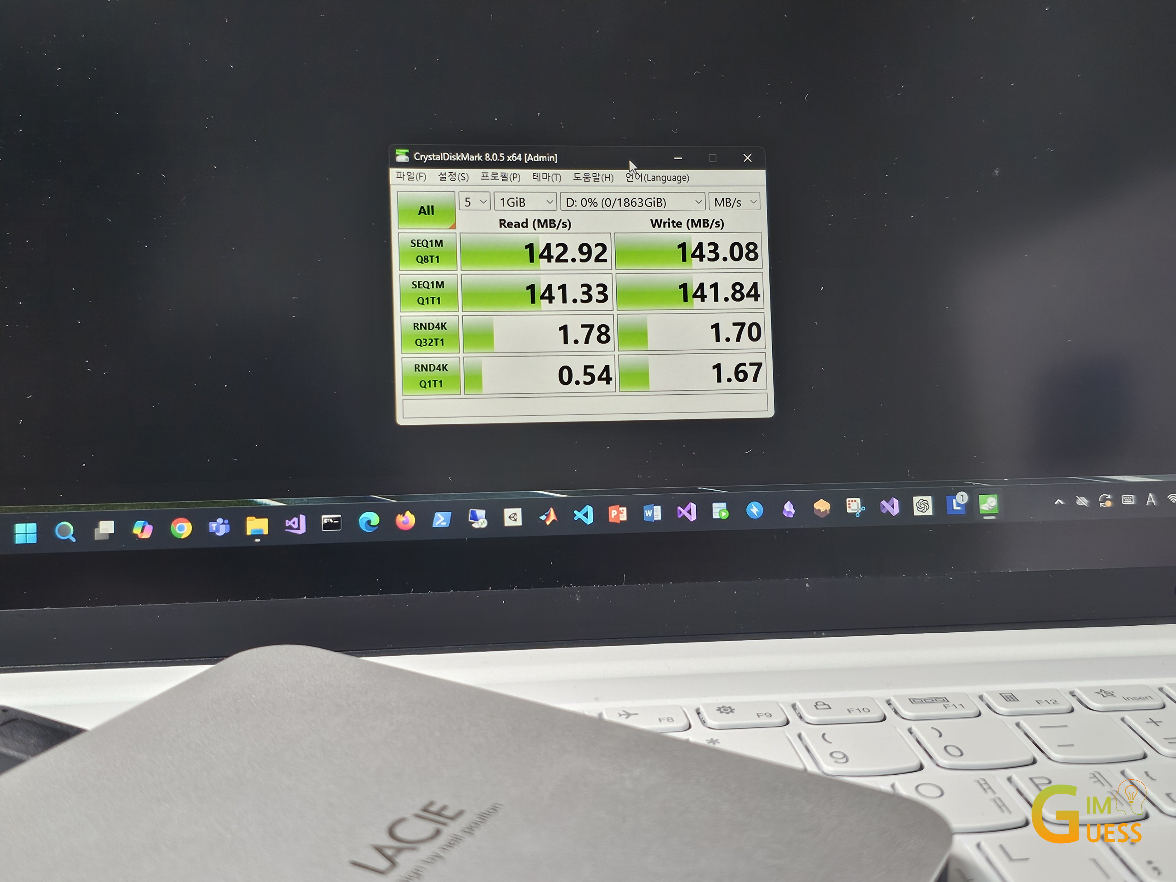 이제 직접 읽고 쓰는 속도를 테스트 해보기 위해 벤치마크 프로그램을 통해 LaCie Mobile Drive의 실제 성능을 측정해보겠습니다. 전 맥북을 보유하고 있지 않아, 테스트는 썬더볼트4 포트가 탑재된 제 노트북에 연결하여 진행하였습니다.