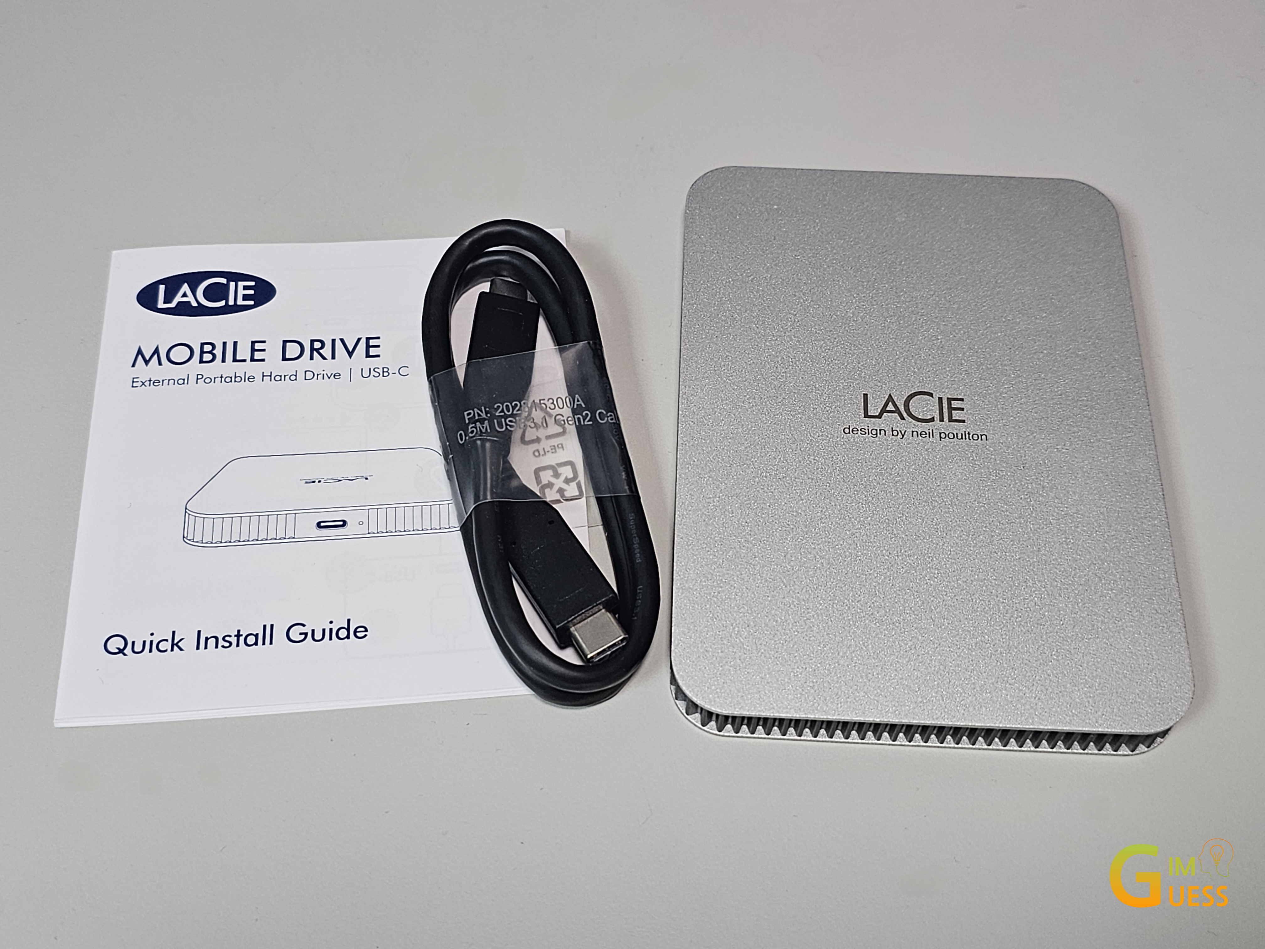패키지의 구성은 LaCie Mobile Drive USB-C 2TB 본체와 사용 설명 가이드, USB C to C가 전부입니다. 필요한 것만 담은 심플한 구성이 돋보입니다.